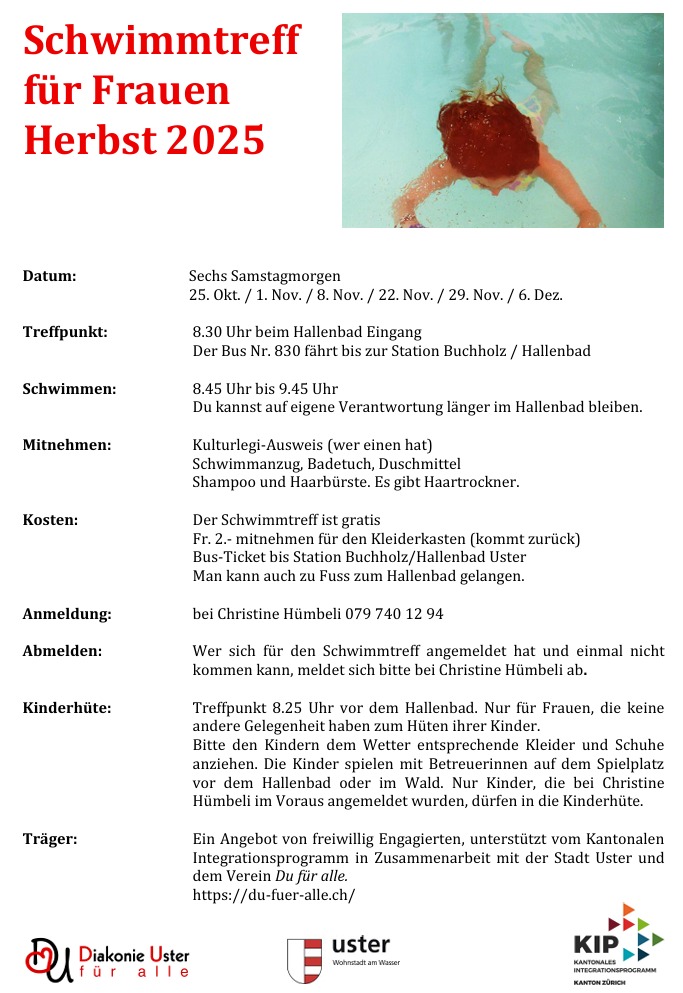 Anbei finden Sie den Flyer für den Schwimmtreff für Frauen im Hallenbad Uster. Es wird ein Kinderhütedienst angeboten.